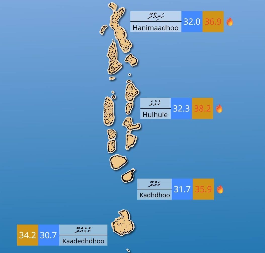 ހދ.ހަނިމާދޫގެ އިހްސާސްކުރެވޭ ހޫނުމިން 36.9 ޑިގްރީގައި ހުރިއިރު ކައްދޫ ސަރަހައްދުގައި އިހްސާސްކުރެވޭ ހޫނުމިން ހުރީ 35.9 ގައެވެ.